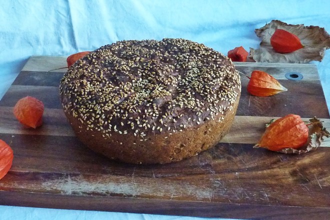 Sesam im Brot schmeckt immer gut, das kommt durch die Röstaromen, die sich beim Backen bilden. Nun habe ich für dieses Brot auch den Sesam geröstet, der in das Brot kommt, das gibt zusätzlich noch einmal ein Röstaroma. Wieder ist es ein kleines Brot, welches ich im Topf gebacken habe, die sind schnell ausgegessen und dann gibt es wieder ein Frisches.