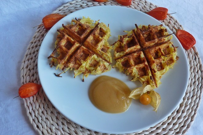Kartoffelrösti hatten wir schon sehr lange nicht mehr. Nun habe ich ja mein neues Waffeleisen und da gehen auch herzhafte Waffeln wunderbar, so auch die Kartoffelrösti, die natürlich anders sind, als die, die man im Fett ausbrät. Also eben fettärmer, da ich im Waffeleisen keines benutze. Aber mit Apfelmus serviert extrem lecker, es geht also auch ohne viel Fett.