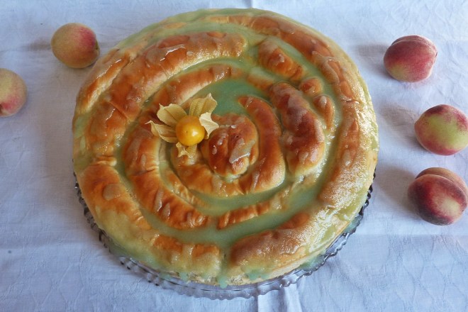 Hefeschnecke XL, mit Pfirsich-Quarkfüllung