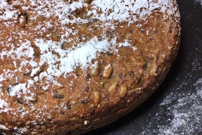 Momentan versuche ich gerade, ein paar Mehle zu verbrauchen, um sie dann wieder frisch aufzufüllen. Dieses Brot besteht zu 100 % aus Weizenvollkornmehl und ei Saaten werden vorher auch noch in kochendem Wasser eingeweicht. Das Ergebnis ist ein kerniges, feuchtes Brot. Da ich es leider in meinem grossen Topf gebacken habe ( warum auch immer ;)), ist es ein wenig flach geworden. Also nehmt einen kleineren Topf als meinen, der 24 cm hat 🙂Weizenvollkorn (12)