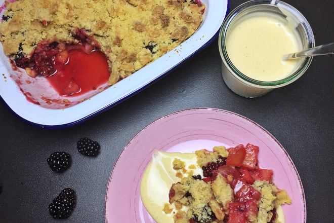 Nach einem leckeren Menu kommt ein Dessert, das ist bei mir irgendwie ein Muss. Ein fruchtiges Crumble habe ich heute für euch, welches ich mit der selbstgemachten Custard und einem selbstgemachten Vanilleeis serviert habe. Diese Kombination…süss-säuerlich…kalt…warm…weich…leicht knusprig…passt super zusammen, da ist für jeden Geschmack etwas dabei. Klar, leicht ist es nicht gerade, aber dafür sehr lecker. Natürlich kann man so ein Crumble auch gut zum Kaffee backen und dann geniessen, das ist Jedem freigestellt. Was ich an einem Crumble immer gut finde, ist, dass man es toll vorbereiten kann und im Kühlschrank wartet es dann auf seinen Einsatz. Weiterlesen