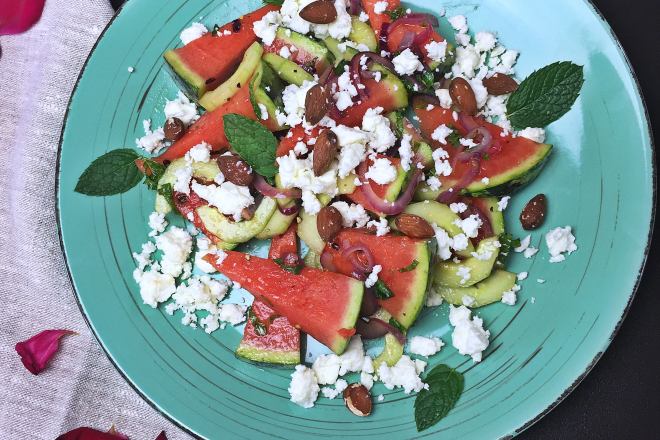 Wassermelonen-Feta-Salat mit Minze und gerösteten Mandeln