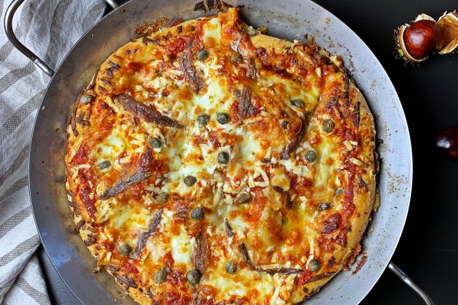 4-Käse-Pfannenpizza mit Sardellen und Kapern zum 51.#synchronbacken
