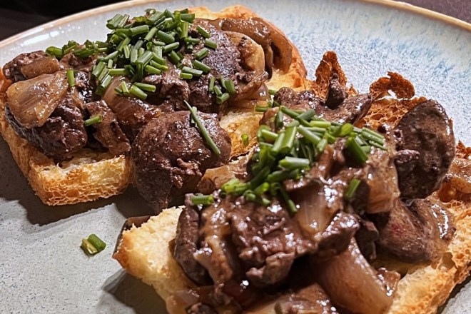 Würzige Hähnchenleber & Bruschetta mit Grillschalotten und Schnittlauch…Von Julius Roberts