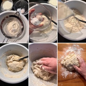 Siebt das Mehl in eine grössere Schüssel, gebt Salz und Natron hinzu und verrührt dieses. Nun kommt noch die Buttermilch in die Schüssel, verrührt alles mit einem Holzlöffel, wenn die Flüssigkeit soweit gebunden ist, knetet ihr mit der Hand weiter.