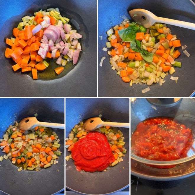 Gebt in einen Topf das Olivenöl, schwitzt darin bei kleiner Hitze die Zwiebeln, Karotten und Staudensellerie etwa 10 Minuten an ( kann auch gerne länger sein, wichtig ist, dass es viel Olivenöl ist und das Gemüse so nicht anbrennen kann ).