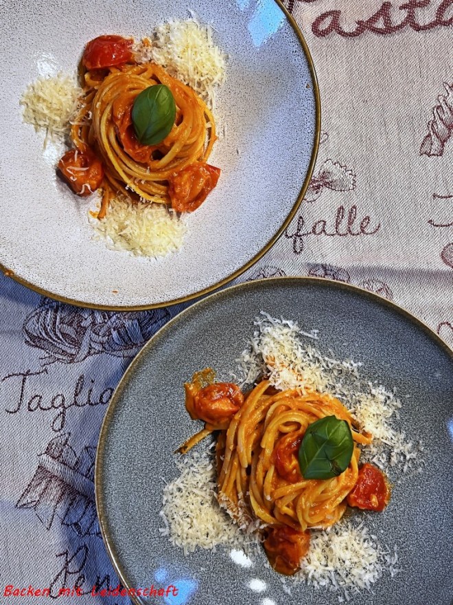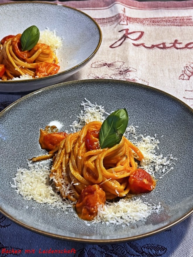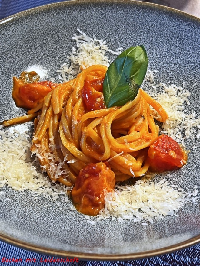 Pasta könnte es theoretisch bei uns jeden Tag geben, Pasta ist so vielfältig…es gibt unzählige Sorten und Formen und dann die Saucen, Sugo´s, Ragu`s, etc., da gibts ja eigentlich nichts, was es nicht gibt. So kann ein Pastagericht immer anders sein, nie langweilig, immer lecker. Heute habe ich für euch eine Version mit einer Tomatensauce, sozusagen…denn auch Gemüse ist darin enthalten, sieht man aber nicht mehr, da sie püriert wird. Ich liebe Tomatensauce, besonders im Sommer, wenn die eigenen Tomaten sonnengereift ihr ganzes Aroma abgeben. Aber bis dahin ist es noch ein Weilchen und so greife ich entweder auf meine eingemachten Tomaten im Glas zurück oder wie hier, auf ein Glas Passata aus Apulien, die ist auch unvergleichlich lecker.