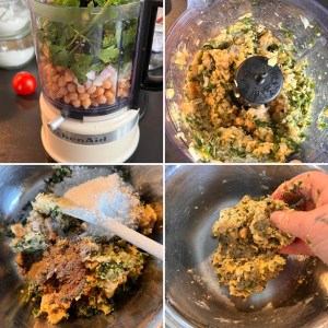 Für die Falafel gebt ihr die Kichererbsen, Zwiebel, Knoblauch und Petersilie in einen Zerkleinerer und hackt diese klein, füllt die Masse um in eine Schüssel. Gebt nun die Gewürze und das Mehl hinzu und verknetet alles gut mit den Händen, schmeckt die Masse noch einmal ab.