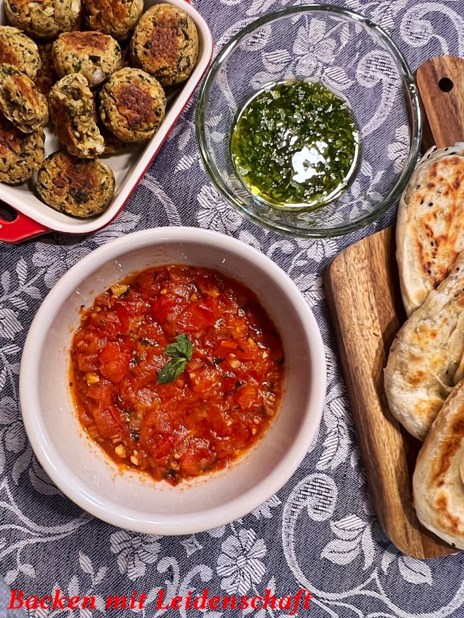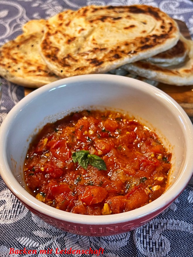 Heute bekommt ihr wie versprochen die Rezepte der Beilagen zum Malawach vom #synchronbacken im Juli. Ich habe mich da auch bei Bistro Badia inspirieren lassen und das Rezept der Tomatensalsa übernommen ( allerdings mit frischer Minze verfeinert ). Diese Tomatensalsa ist so lecker und easy, sie sollte nur abgekühlt sein zum Servieren, sie passt hervorragend zum Malawach.