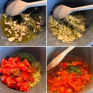 Erhitzt das Olivenöl in einem Topf, gebt die Zwiebeln und den Knoblauch hinein, schwitzt alles bei mittlerer Hitze langsam an für einige Minuten, ohne dass Zwiebeln und Knoblauch viel Farbe bekommen ( das macht sie süss ). Gebt nun die Tomaten und Harissa ( Chili ) hinzu und lasst das Ganze offen bei mittlerer Hitze 15 Minuten köcheln. Gebt die Minze und Salz hinein und lasst alles weitere 15 Minuten köcheln, schmeckt alles noch einmal ab mit Salz und lasst die Salsa abkühlen.