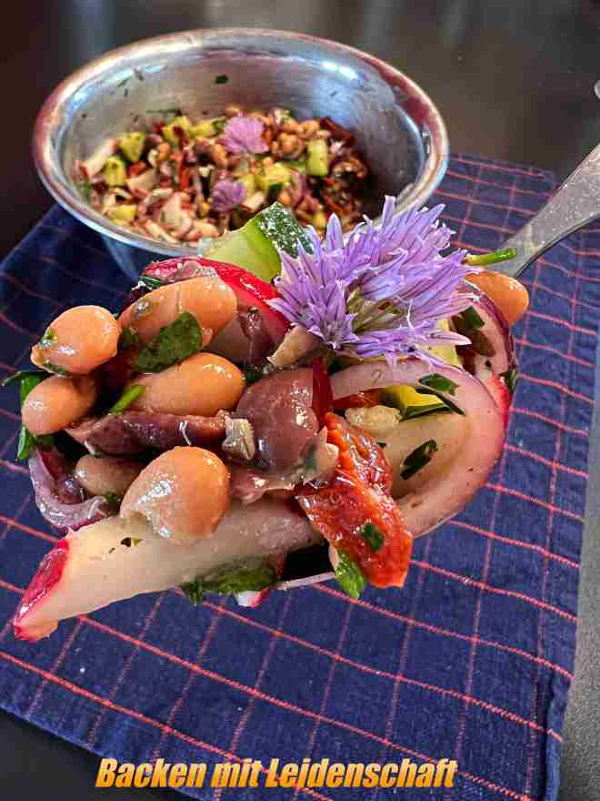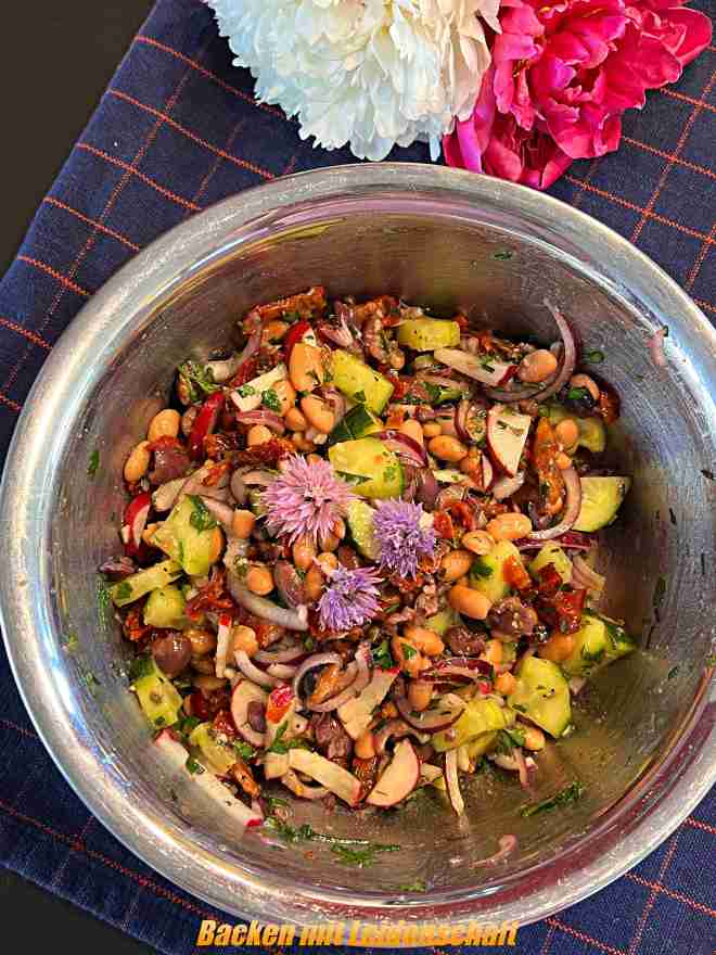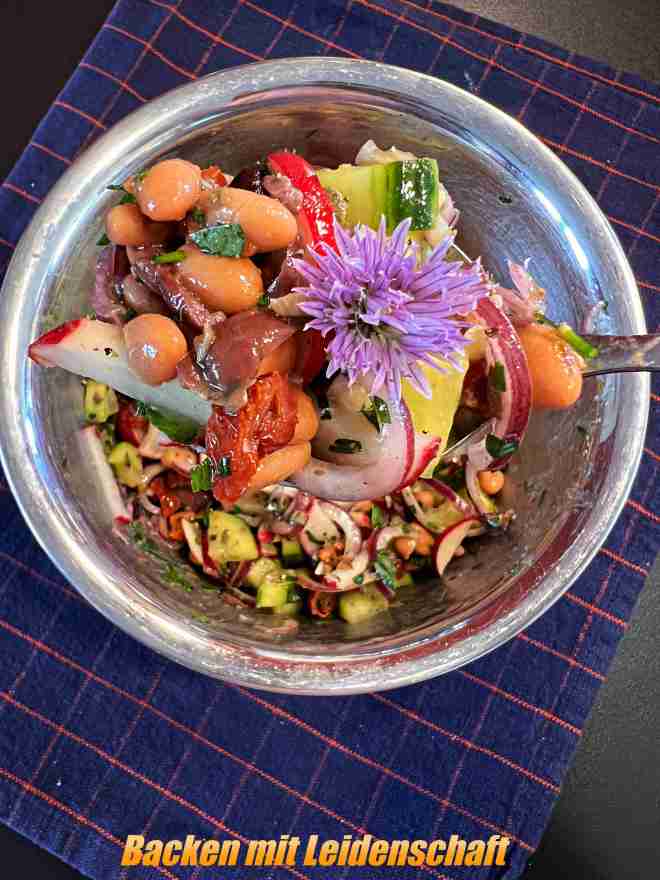 Mal so auf die Schnelle ist dieser mediterrane Bohnensalat entstanden. Wir wollten spontan grillen und irgendein Salat mache ich immer dazu, für uns zwei braucht es nicht viel zum Grillen…ein bisschen Brot, einen Salat und Wurst/Fleisch dazu. Wie so oft stöbere ich dann in meinen Vorräten und daraus entstehen dann meistens einfache und leckere Rezepte, so auch dieses Mal. Der mediterrane Bohnensalat sollte dann noch ca. 1 Stunde im Kühlschrank durchziehen und kann dann genossen werden.