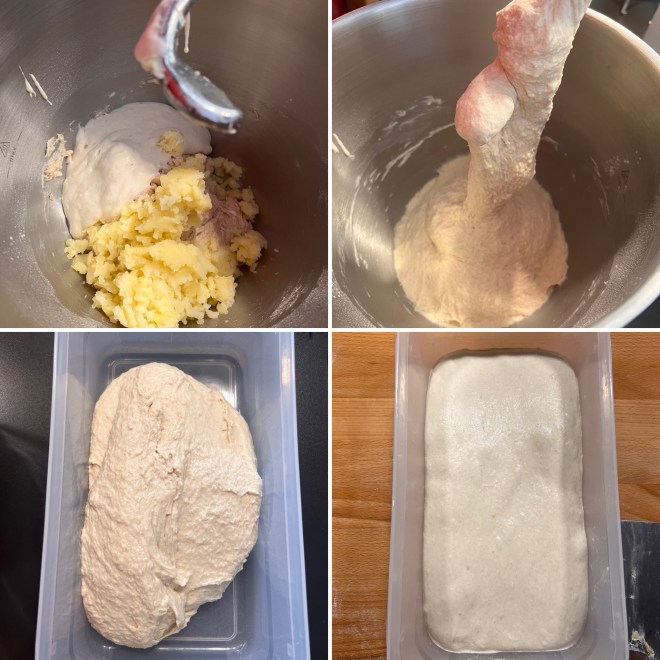Gib LM und Kartoffeln zum Autolyseteig, verknete alles noch einmal ca. 3 Minuten, falls nötig, gib noch einen Schluck Wasser hinzu, aber erst nach einiger Zeit, die Kartoffeln geben während des Knetens Feuchtigkeit ab und es kann sein, dass dein Teig kein zusätzliches Wasser mehr braucht.