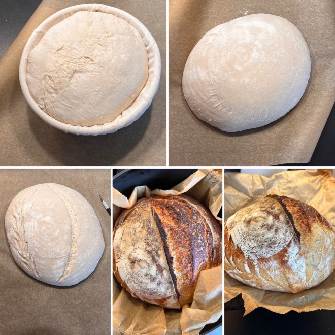 Nimm dein Gärkörbchen aus dem Kühlschrank, wenn der Backofen heiss genug ist, stürze den Teigling vorsichtig auf ein Backpapier. Schneide mit einer scharfen Klinge, zB. einer Rasierklinge, deinen Teigling ein, ein langer Schnitt von ca. 1 cm Tiefe und gerne auch ein Muster, welches du eher oberflächlich einritzt.
