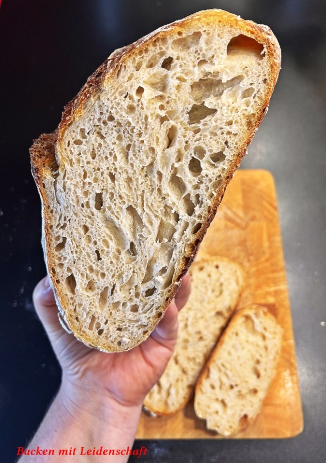 Ich brauche kein Rezept mehr, ich orientiere mich an der Formel 100 % Mehl, 20 % Lievito Madre, 2-2,2 % Salz und ca. 70 % Wasser. Das ist die Grundformel, die ich nutze, Zeit und Geduld eingeschlossen.