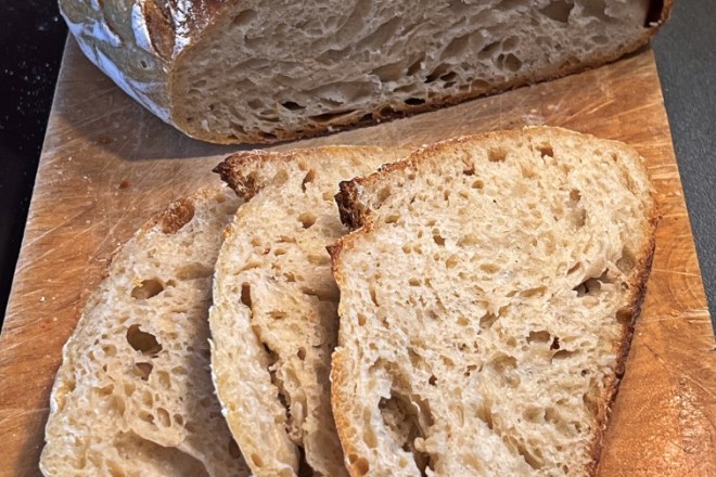 Nimm den Topf aus dem Backofen, das Brot aus dem Topf und lass es auf einem Gitter komplett auskühlen, bevor du es anschneidest. Du bekommst ein sehr luftiges, weiches und feuchtes Brot, das lange frisch hält.