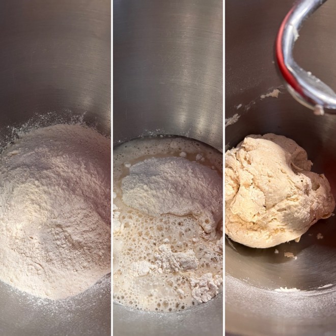 Alles in einer Rührschüssel kurz verkneten, abdecken und ca. 1-2 Stunden ruhen lassen.