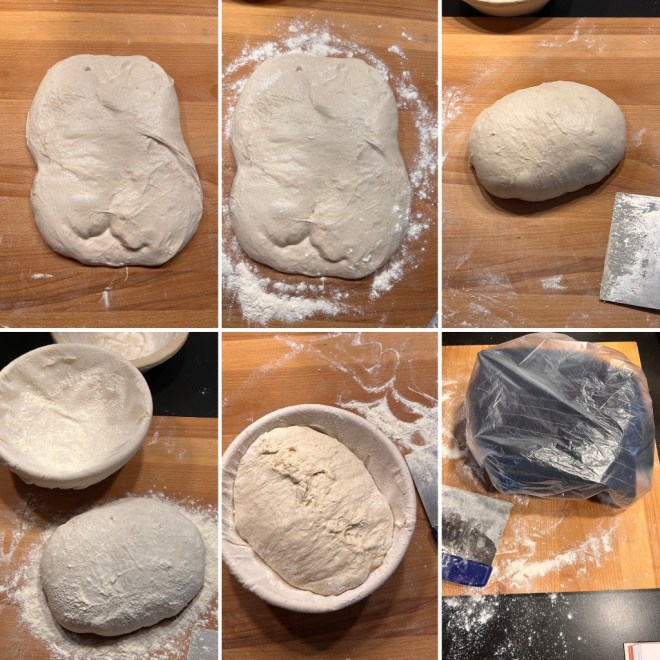 Gib den Teig in eine Schüssel, decke den Deckel drauf. Nun lässt du den Teig bei Zimmertemperatur aufgehen. 2 x nach jeweils 30 Minuten macht du Stretch and fold, dann 2 x nach jeweils 45 Minuten Coil Fold. Dein Teig verändert sich in dieser Zeit und wird sehr elastisch. Befeuchte dafür deine Hände. Lass nun den Teig noch ruhen, bis er sich zu ca. 3/4 vergrössert hat und eine Bläschenbildung zu verzeichnen ist. Optimale Temperatur dafür sollte bei 25 Grad liegen, hier entscheidet die Temperatur über die Dauer. Bei mir sind es meist so ca. 5-6 Stunden.