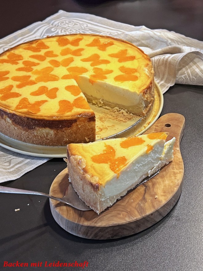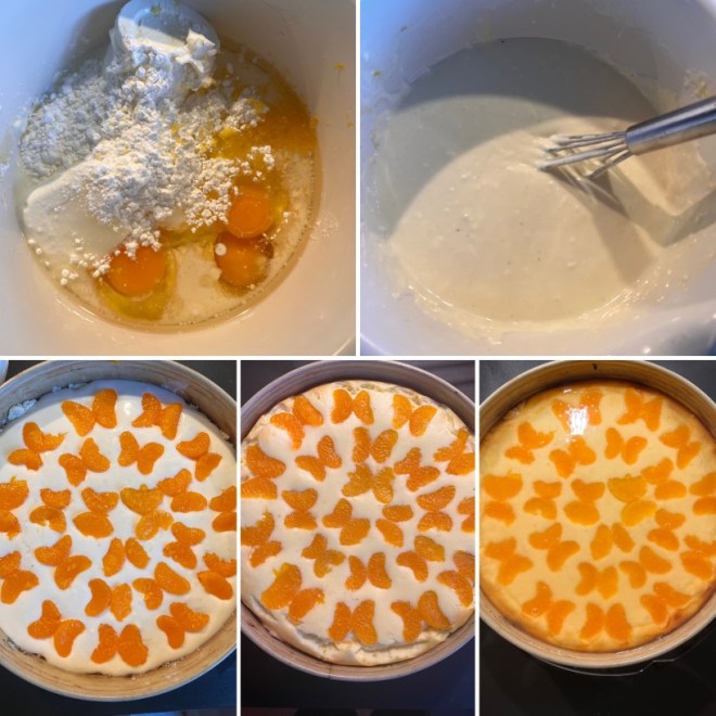 Verteile nun die Mandarinen auf der Oberfläche, gerne auch wie ich, dass es kleine Schmetterlinge werden.