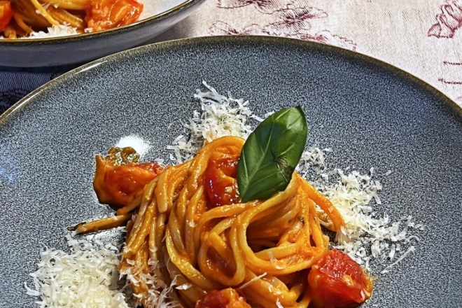 Pasta e basta…es gibt für mich kaum was Besseres, als selbstgemachte Pasta. Gibt es bei uns tatsächlich sehr regelmäßig, denn wenn man erstmal Routine darin hat, geht das ziemlich fix. Und ist auch nicht schwierig, du kannst ja gerne mal in meinen Online-Workshops vorbeischauen, da zeig ich dir Pasta von Hand gemacht. Aber bevor ich abschweife…es geht ja hier um ein leckeres Rezept, welches übrigens aus dem Buch „Pasta al Pomodoro“ von Ilse Fischer aus dem Christian-Verlag. Da gehts tatsächlich nur um Pasta mit Tomaten, in vielen verschiedenen Varianten, von einfach bis aufwändig, von wenigen einfachen Zutaten bis viele und aussergewöhnliche Zutaten. Also für jeden was dabei. Ich hab mir wieder ein einfaches Rezept mit wenigen Zutaten herausgesucht, das ist so eher meine Kochphilosophie.