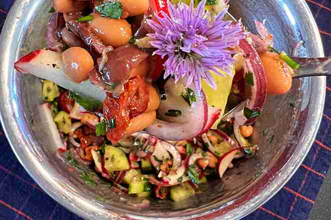 Mal so auf die Schnelle ist dieser mediterrane Bohnensalat entstanden. Wir wollten spontan grillen und irgendein Salat mache ich immer dazu, für uns zwei braucht es nicht viel zum Grillen…ein bisschen Brot, einen Salat und Wurst/Fleisch dazu. Wie so oft stöbere ich dann in meinen Vorräten und daraus entstehen dann meistens einfache und leckere Rezepte, so auch dieses Mal. Der mediterrane Bohnensalat sollte dann noch ca. 1 Stunde im Kühlschrank durchziehen und kann dann genossen werden.