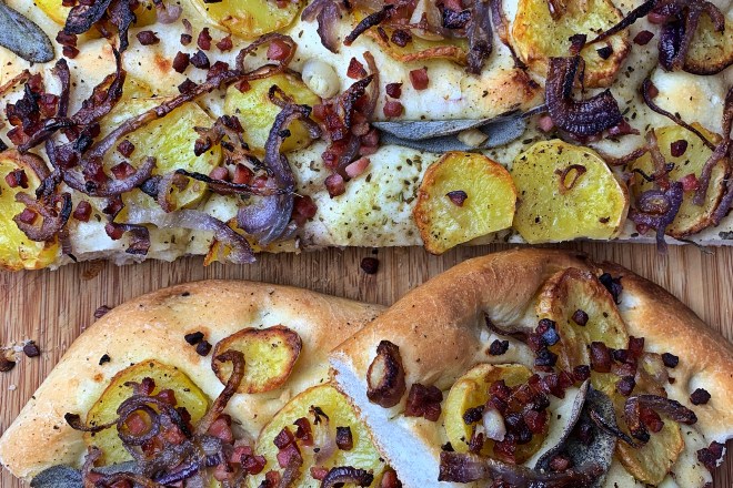 Focaccia mit Kartoffeln, Speck, Zwiebeln und wildem Fenchel
