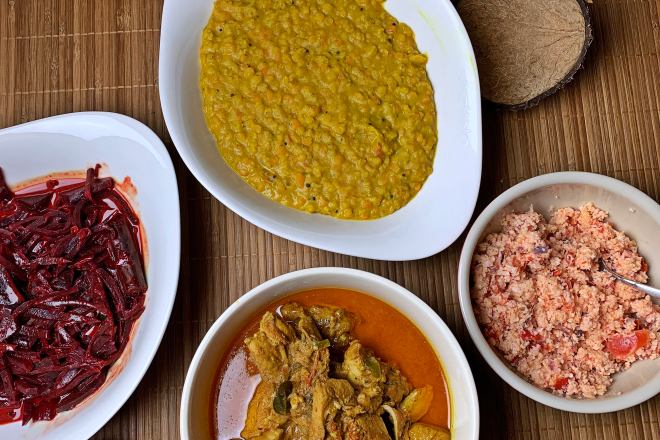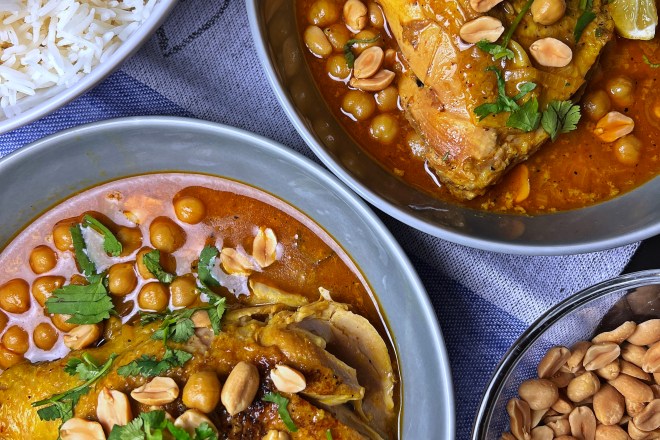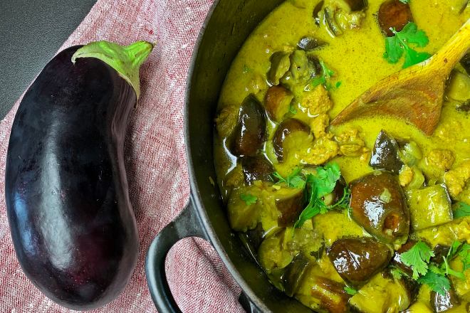 Hühnchen, in Kokosmilch geschmort mit Kichererbsen und Limetten