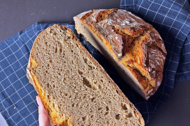 Rustikales Weizenbrot mit Weizenvollkorn und Sauerteig aus dem Topf