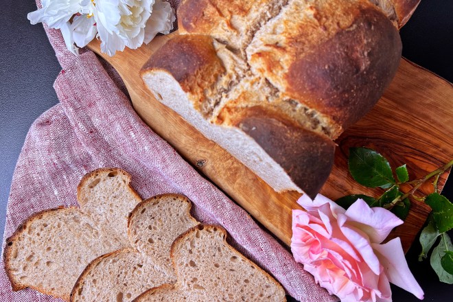 Rustikales Weizenbrot mit Weizenvollkorn und Sauerteig aus dem Topf